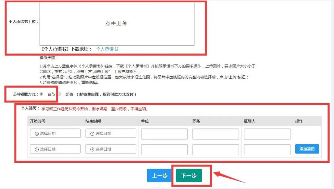 10、個人簡歷:根據要求,學習和工作經歷從現(xiàn)今開始,倒序填寫,至少填兩條,不得空項。填寫完成后點擊“下一步”