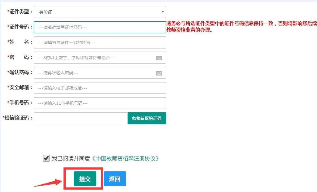 ②輸入【身份證號】請務必與所選證件類型中的證件號碼信息保持一致,否則影響您后續(xù)教師資格業(yè)務辦理。