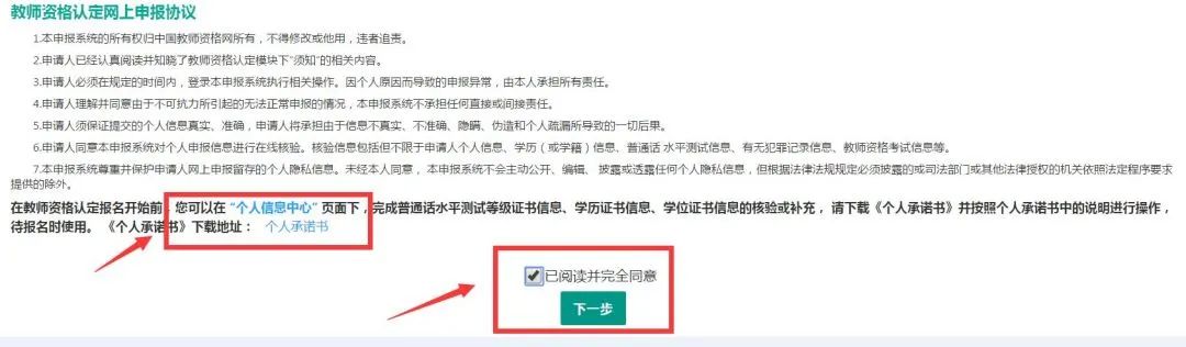 點擊【個人承諾書】下載打印,并簽字填寫日期,拍照片等會上傳。再次點擊【已閱讀并完全同意】進入【下一步】